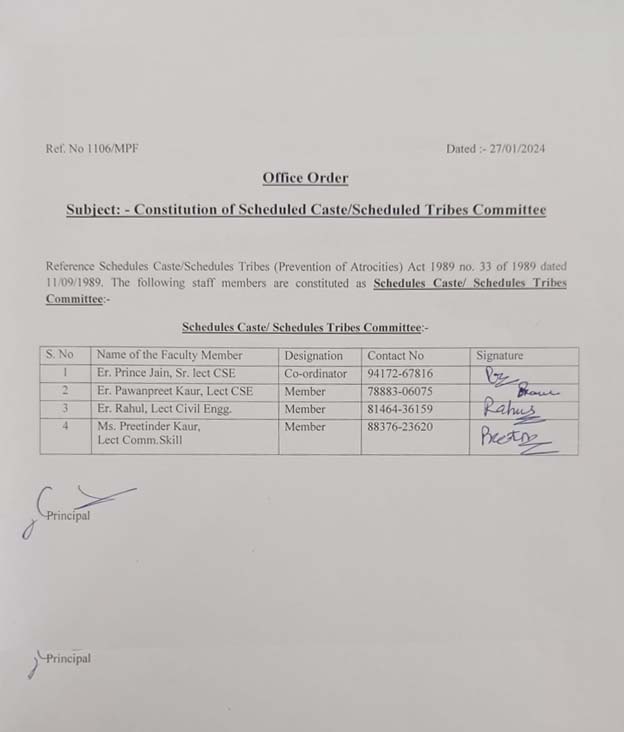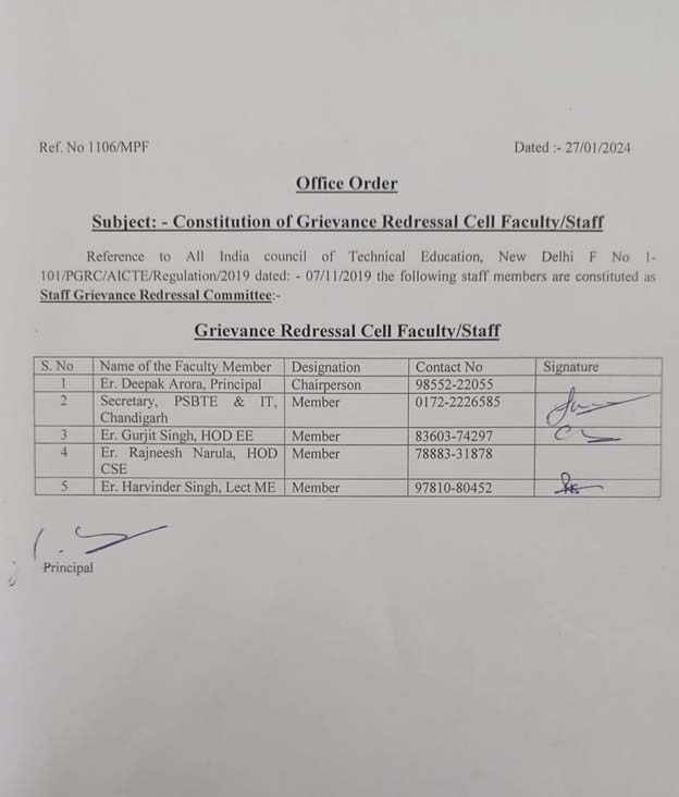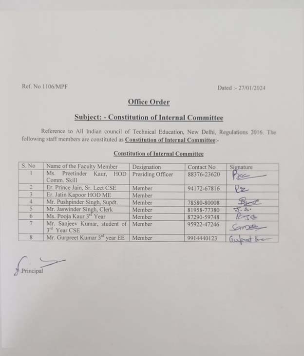 The institute is duly approved by AICTE(New Delhi) and Govt Of Punjab. We have intake of 60 seats in each course.At present the institute offers the following three year diploma courses in: